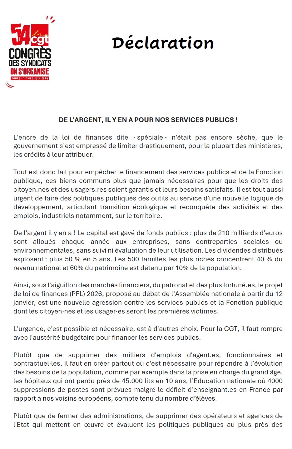 DECLARATION CGT : DE L’ARGENT IL Y EN A, POUR NOS SERVICES PUBLICS !