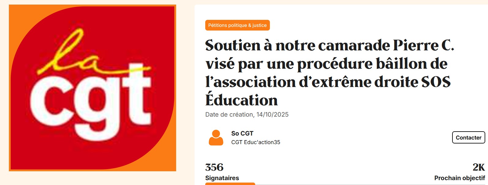 La CGT Éduc’action 35, la CGT Educ’action, la FERC-CGT et l’Union Départementale CGT 35 ont appris la convocation de Pierre C., militant à la CGT Éduc’action 35, devant le tribunal correctionnel de Rennes le 11 décembre 2025, suite à une plainte pour diffamation de SOS Éducation.