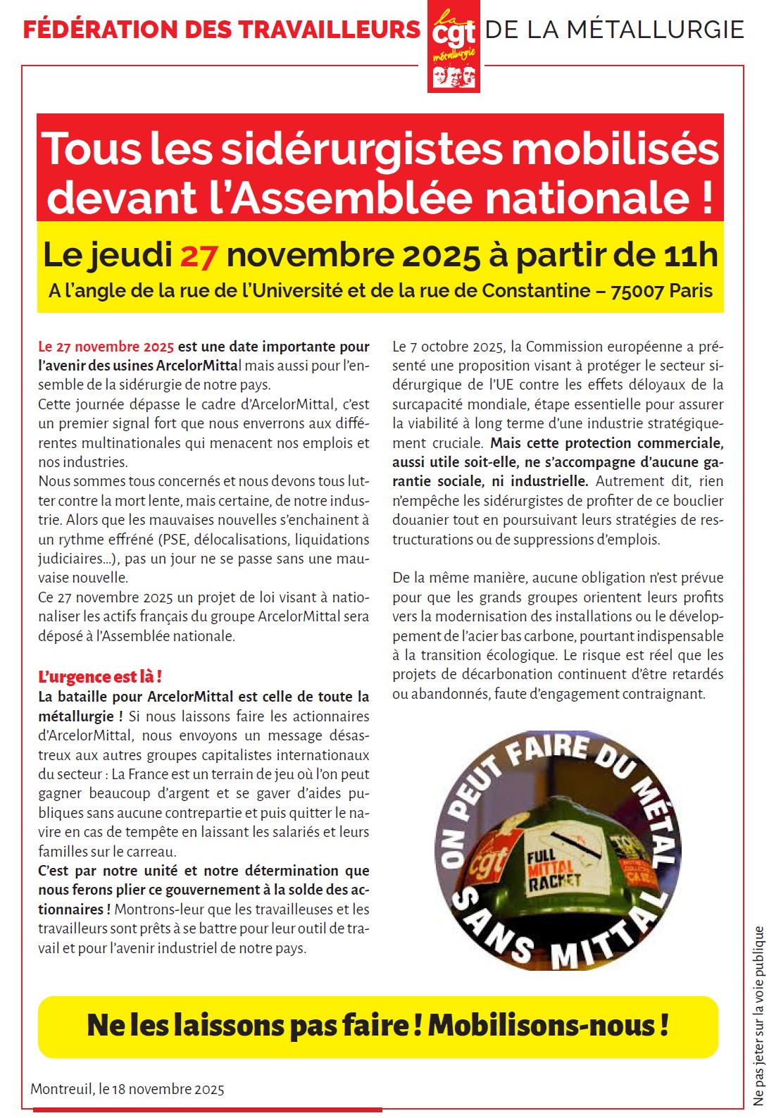 Tous les sidérurgistes mobilisés devant l’Assemblée nationale ! Le jeudi 27 novembre 2025 à partir de 11h A l’angle de la rue de l’Université et de la rue de Constantine – 75007 Paris Le 27 novembre 2025 est une date importante pour l’avenir des usines ArcelorMittal mais aussi pour l’ensemble de la sidérurgie de notre pays. Cette journée dépasse le cadre d’ArcelorMittal, c’est un premier signal fort que nous enverrons aux différentes multinationales qui menacent nos emplois et nos industries. Nous sommes tous concernés et nous devons tous lutter contre la mort lente, mais certaine, de notre industrie. Alors que les mauvaises nouvelles s’enchainent à un rythme effréné (PSE, délocalisations, liquidations judiciaires…), pas un jour ne se passe sans une mauvaise nouvelle. C’est par notre unité et notre détermination que nous ferons plier ce gouvernement à la solde des actionnaires ! Montrons-leur que les travailleuses et les travailleurs sont prêts à se battre pour leur outil de travail et pour l’avenir industriel de notre pays. Ne les laissons pas faire ! Mobilisons-nous !![]()